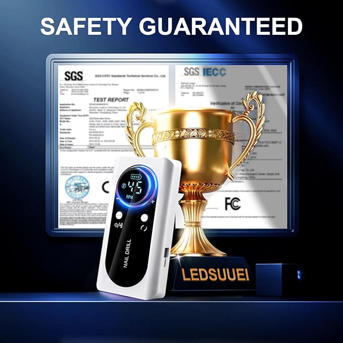 - SGS Certification - Super Power: LEDSUUEI professional nail file electric capable of rotating up to 45000 rpm. It has been certified by the SGS certification authority and has super power. Our nail file electric can meets all your needs multifunctional use for nails prep, acrylic nails, gel nails, dip powder nails, thick nails, nail grinder, manicure & pedicure, callus removal, natural nails, routing, polishing, etc. Handle everything from gel polish removal to acrylic nail prep with ease.