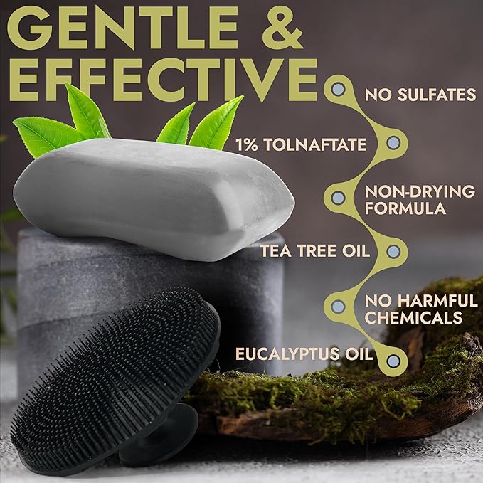 - Deep Clean & Refresh Your Skin: The 1% Tolnaftate formula eliminates fungus while Tea Tree Essential Oils nourish irritated skin. Includes Scrubber for Deeper Cleansing & Exfoliation, making this antifungal soap for cleansing and protection.