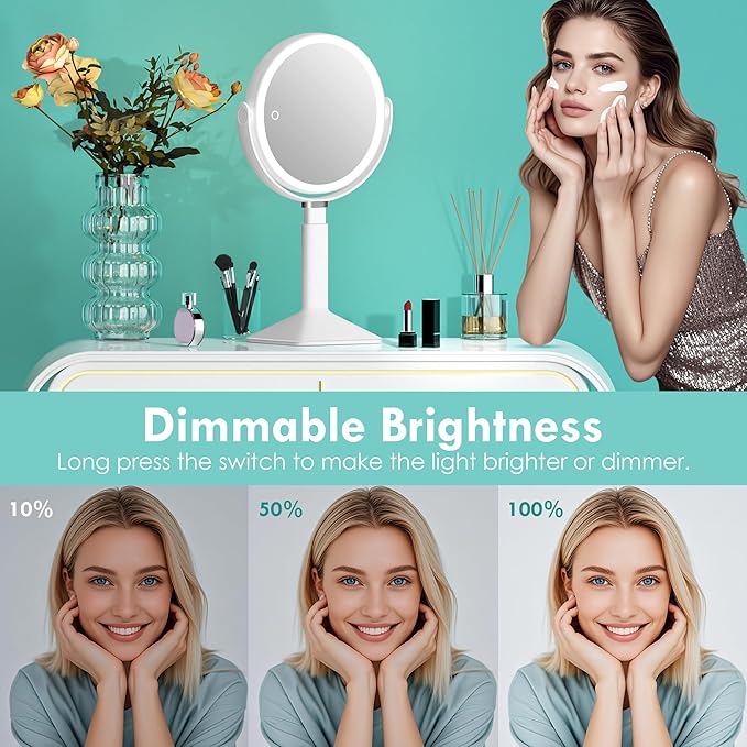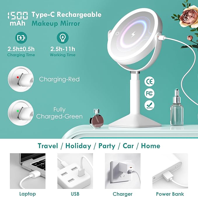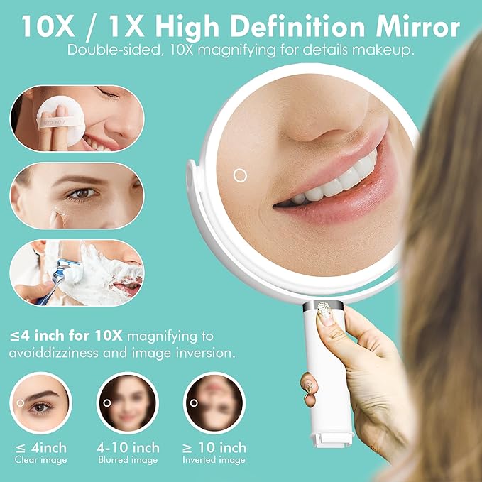 - 🔍 Dual-Sided Mirror with 10X Magnification: Features a standard 1X mirror for everyday use and a 10X magnified side for precise tasks like tweezing and detailed makeup application. Both sides feature intuitive touch controls to adjust brightness and color temperature effortlessly.