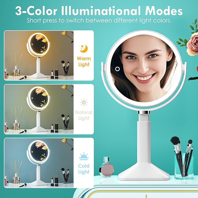 Makeup Mirror with Lights,Magnifying Mirror with Light and Touch Sensor, 1x/10x 360° Rotation Vanity Mirror with 3 Color Light,Rechargeable Double Sided Lighted Desktop Mirror,Women Gift-White
