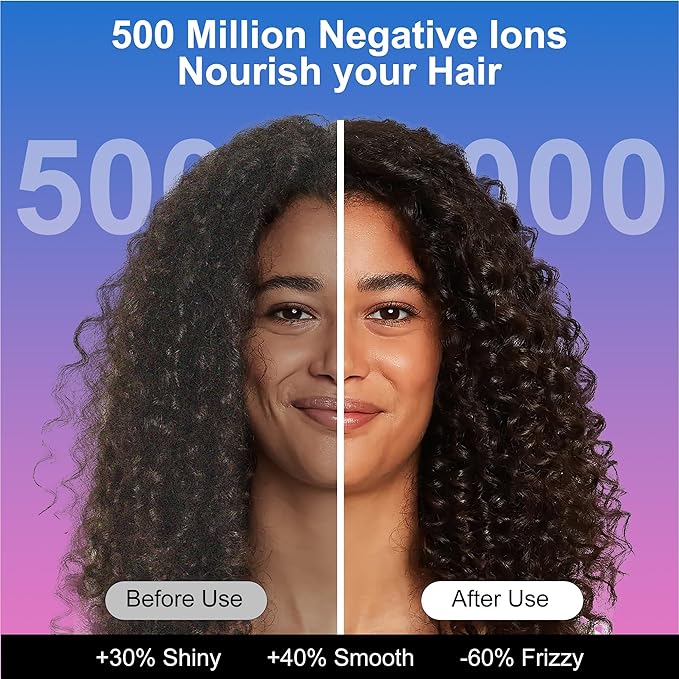 - 【Negative Ion Technology】 This ion hair dryer can release 500 million negative ions per second. These negative ions will attach to the surface of the hair, neutralizing the positive charges generated by friction on the hair, making the hair smooth, reducing frizz and split ends. This hair dryer is a built-in smart chip to control the temperature. By monitoring the temperature at the air outlet, it keeps the temperature stable and avoids damaging the cuticle of the hair due to excessive heat.
