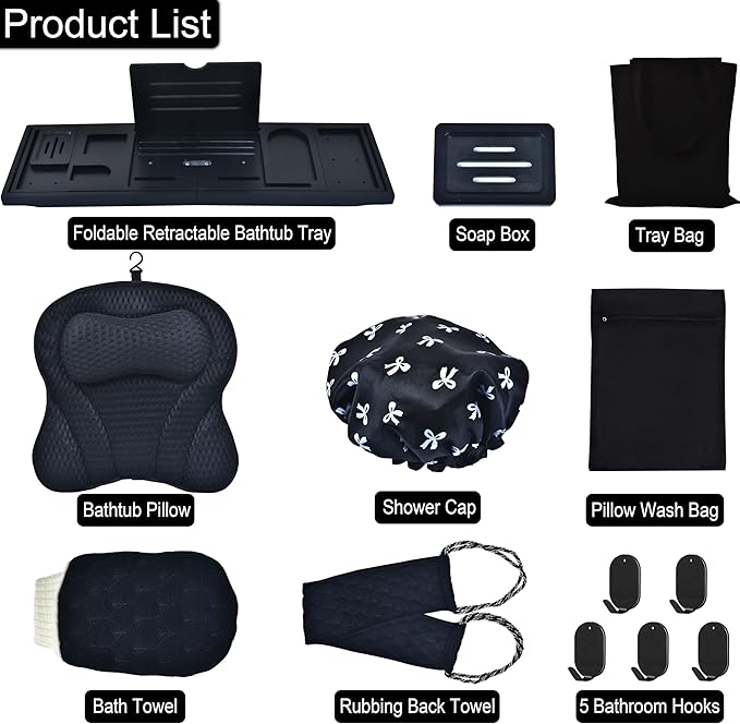 - Black Luxury Shower Accessory Set:The set includes foldable and retractable bamboo tray, a soft and comfortable ergonomic 4D mesh bath pillow, 2 Bath Towels,Bow Patterned Shower Cap,5 Bathroom Hooks,Tray storage bag,bath pillow cleaning bag