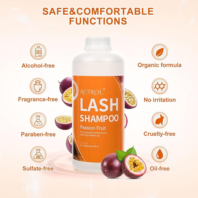Eyelash Extension Cleanser Passion Fruit 1L Natural Lash Extension Shampoo Professional Eyelid Foaming Cleanser Paraben & Sulfate Free Non-lrritating with Salon and Home Care