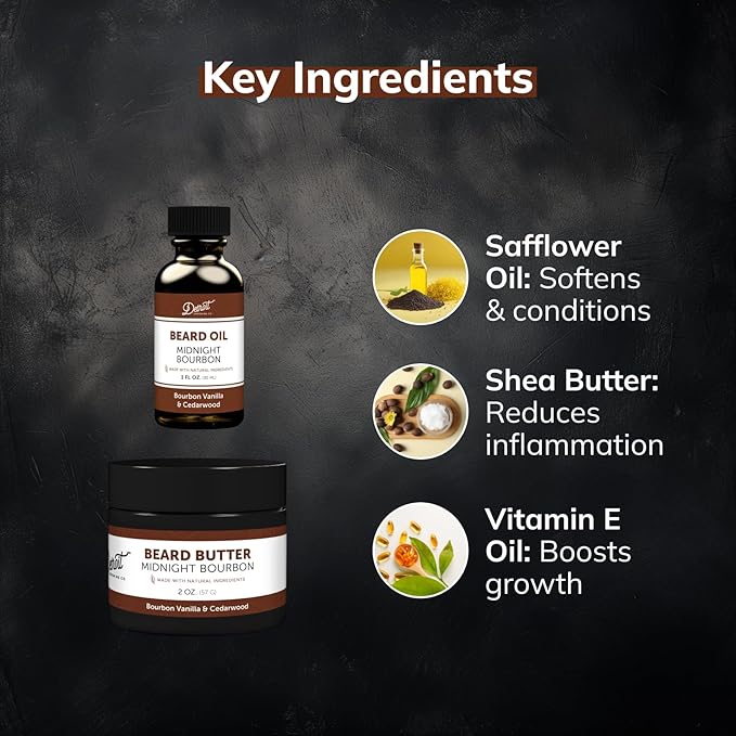 - Moisture & Control: The Midnight Bourbon Beard Oil hydrates and softens, while the Beard Butter locks in moisture and adds control, making it easier to style and maintain a healthy-looking beard.