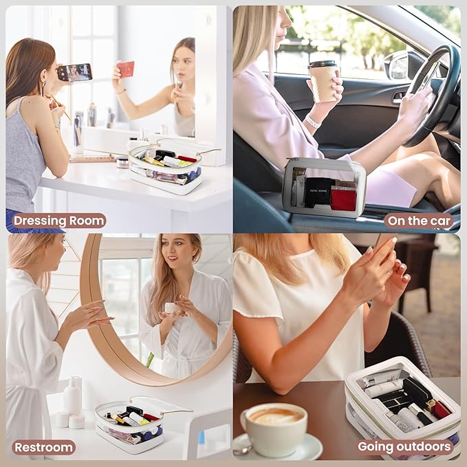 Clear Makeup Bag, Travel Clear Cosmetic Bag and Makeup Brush Bag, Transparent Portable Makeup Case, Waterproof Toiletry Bag with Zipper for Women, White