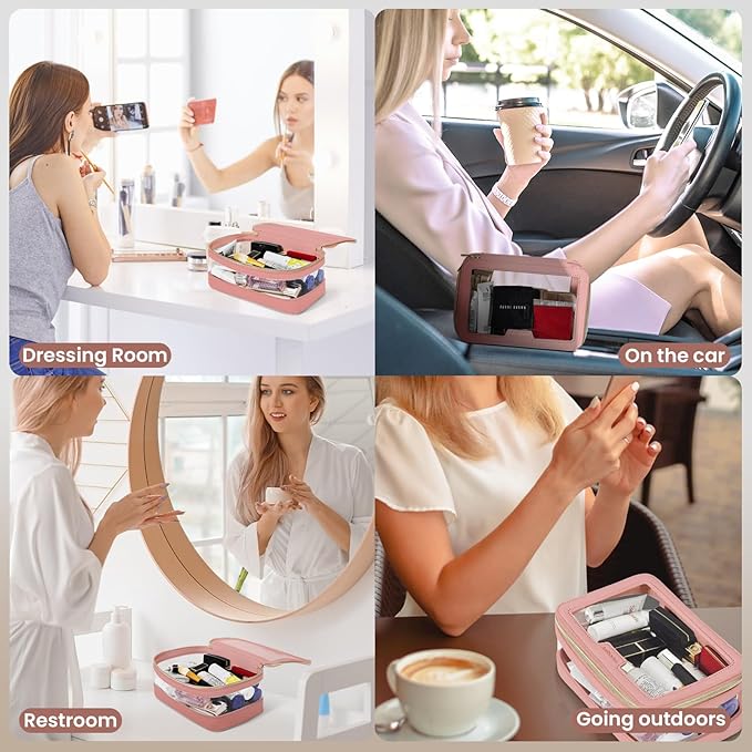 Clear Makeup Bag, Travel Clear Cosmetic Bag and Makeup Brush Bag, Transparent Portable Makeup Case, Waterproof Toiletry Bag with Zipper for Women, Pink