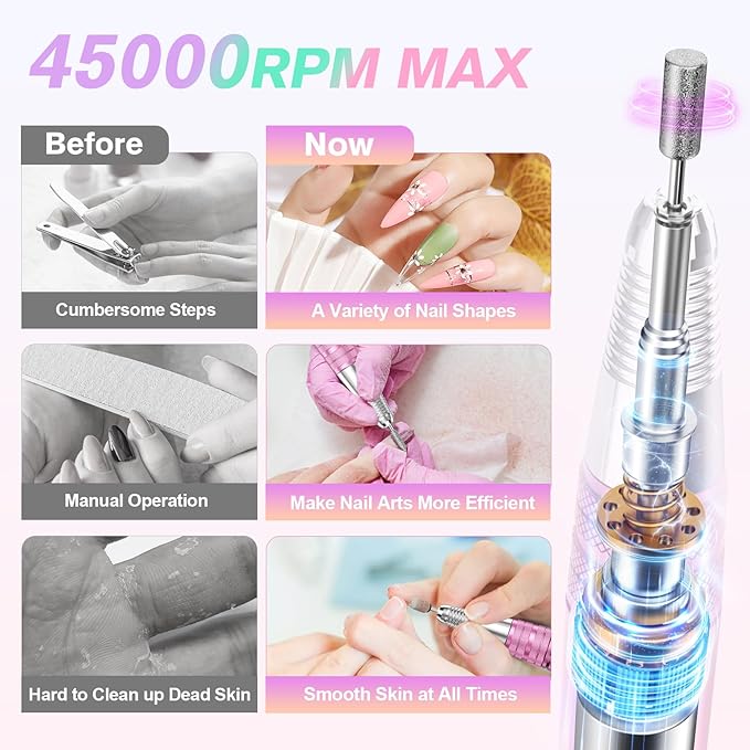 - 45000 RPM HIGH-TORQUE NAIL DRILL: Professional nail drill is equipped with high-quality bearings, allowing for smooth operation at high speeds (up to 45,000 RPM) with adjustable speeds controlled by an easy-to-use rotating knob. The 13v output makes it even more powerful than most stationary nail drills, enabling it to work faster on acrylics, gels, and dips
