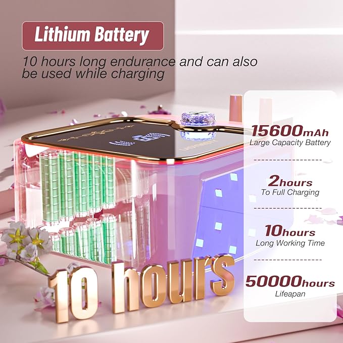 - [Cord-Free Freedom, Limitless Creativity] Break free from the hassle of cords! Our cordless, rechargeable UV LED nail lamp offers unparalleled convenience. Its rechargeable battery delivers 8 - 10 hours of continuous use after just an hour of charging. Boasting an impressive lifespan of over 50,000 hours, this portable gem goes wherever your nail art adventures take you. And yes, you can use it while it charges!
