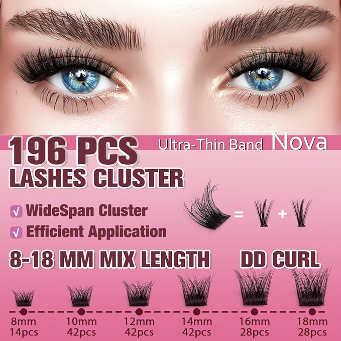 Nova Lash Clusters Kit 8-18mm 3D Volume Fluffy Eyelash Clusters Kit DD Curl - WideSpan DIY Eyelash Extension Kit Cat Eye Lashes Individual Fake Eyelashes Clusters Kit with 0.05mm Ultra-Thin Black Band