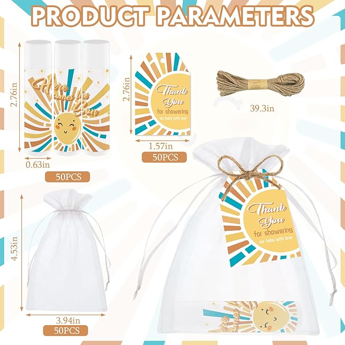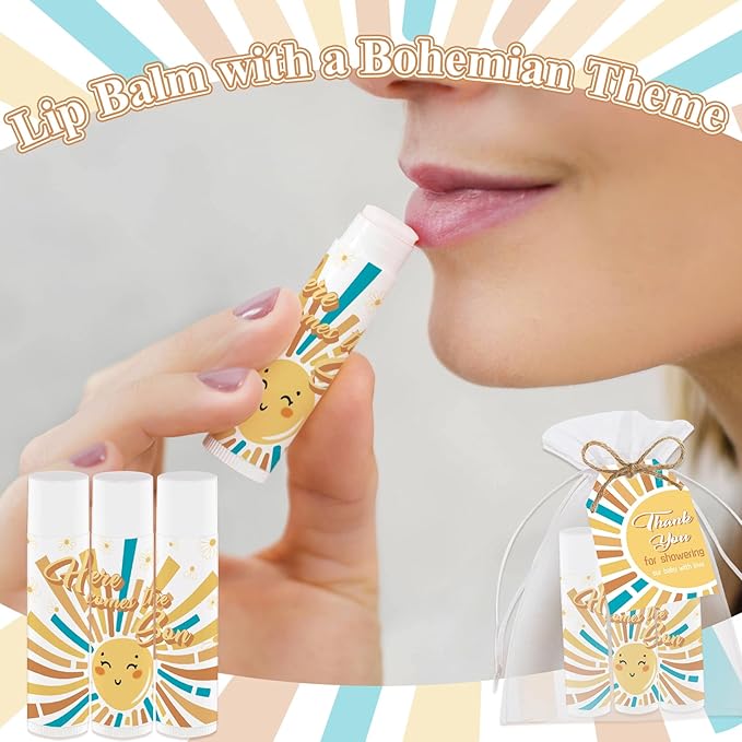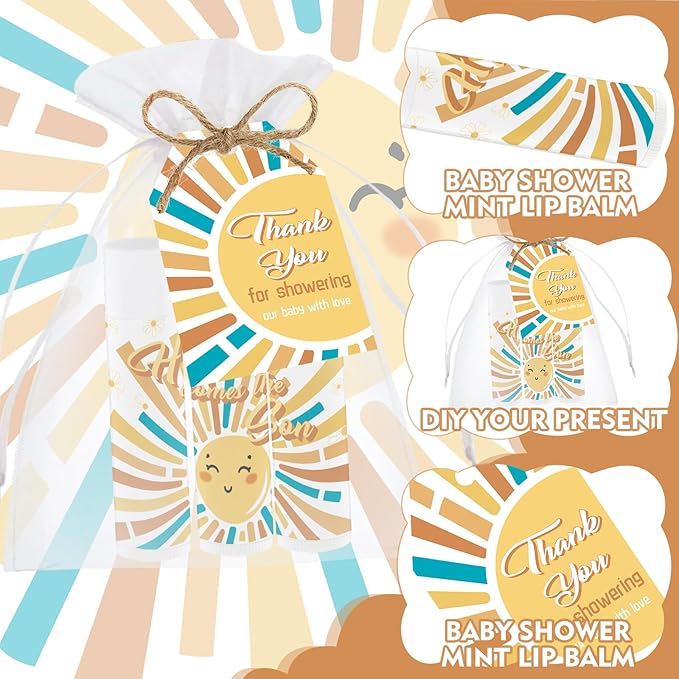 - Comprehensive Package: Our sun theme lip balm party favors include 50 lip balms, 50 organza bags and 50 thank you cards, adequate quantity can meet your gifting needs for baby shower, bridal shower or other parties