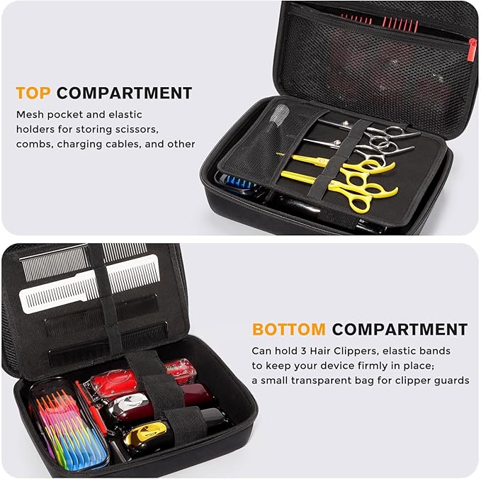 - Dimensions: 11×7.3×3.7 inches. Capable of holding three hair clippers, fits for most brand hair clippers, and can accommodate multiple accessories such as scissors, combs, charging cables, etc