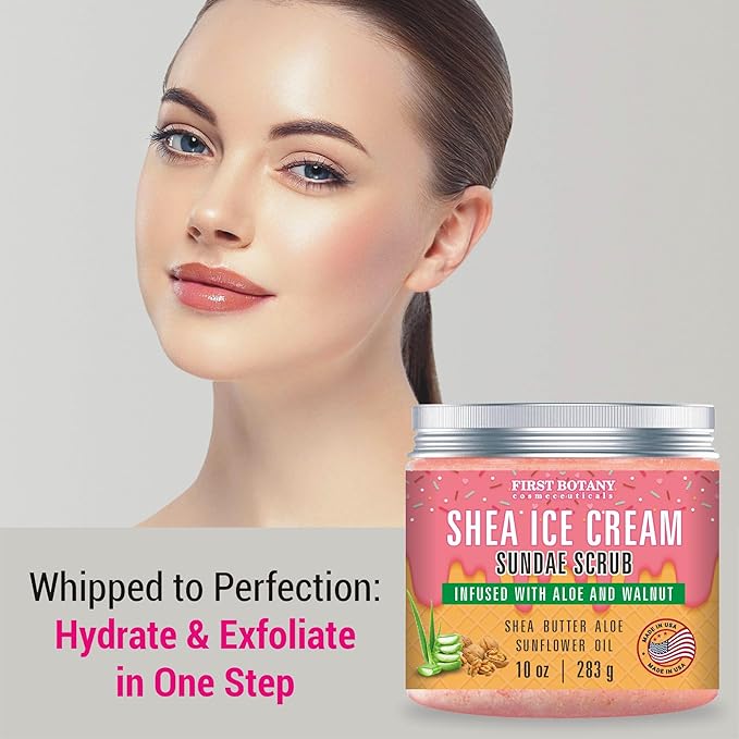 First Botany Body Scrub - Natural Exfoliating Salt Scrub & Body and Face Souffle helps with Moisturizing Skin, Acne, Cellulite, Dead Skin Scars, Wrinkles (10 fl oz, Shea Icecream)