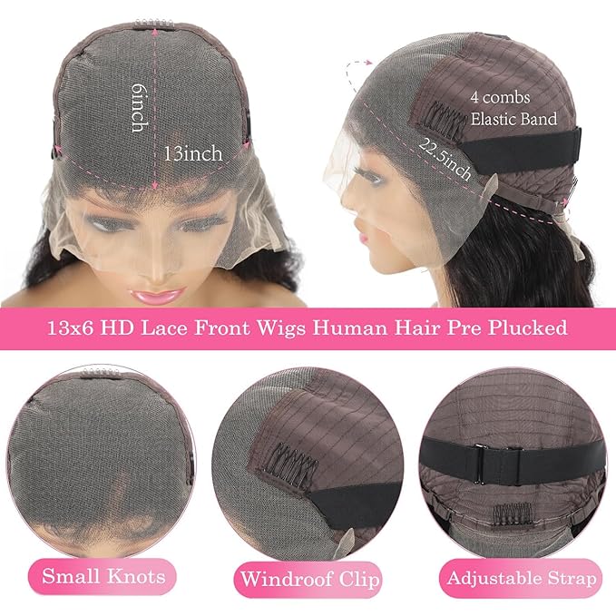 - 【Frontal Wigs Human Hair HD Lace Wig Cap】Human Hair Wig Average Cap Size (21.5-22.5 Inch) with Adjustable Straps and 4 Combs, 13x6 Ear to Ear HD Transparent Lace Frontal Wig, Wear and Go Glueless Wig,Adjustable Elastic Band to Fix it Very Well. Easy to Install, Not Easy to Fall Off,Upgraded Wig Cap,Longer Service Time.