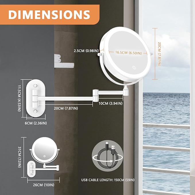1X/20X Wall Mounted Makeup Mirror with Light, 8" Double-Sided Magnifying Mirror, 3 Color Lights Touch Dimmable Vanity Mirror with 360ยฐ Extension Rotation Foldable 14.5 Inch Arm for Bathroom