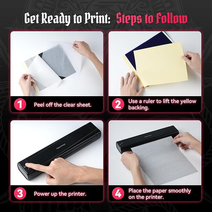 - 2025 Upgraded Wrinkle-resistant Mode and High-Definition Printing: Our tattoo supplies equips a patented wrinkle-resistant mode (adds wrinkle-resistant lines to the edges of the paper) that keeps tattoo paper perfectly flat during printing, minimizes wrinkles and creases on the printed materials, ensuring smooth and high-quality prints every time. The upgraded print head delivers faster and sharper results—work more efficiently and achieve more precise effects