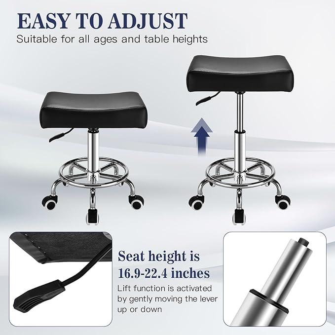 - Free Adjustment - This stool with wheels is equipped with a high-quality gas rod, which not only provides 360° rotation function, but also allows you to adjust the stool 16.9IN-22.4IN with one-handed pressing of the lever. Easily adjust the height of the roller stool according to your height, work surface or personal preference.