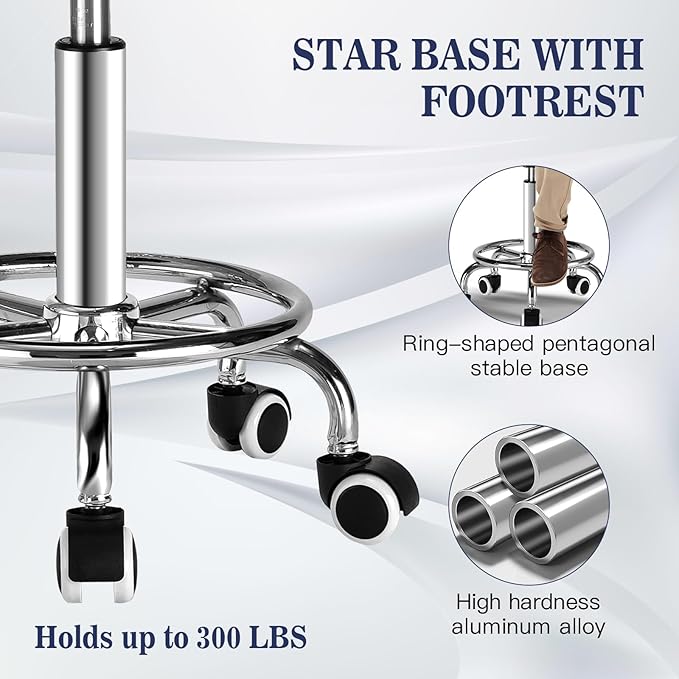 - Holds up to 300 lbs - Our stools with wheels premium chromed metal base is stronger and more durable than plastic bases. It can easily bear up to 300 lbs. The widened foot rest area allows you to easily put your feet on it to rest when you work or study for a long time. Sturdy and durable stylist chair stool, it is your best partner for long-term use.