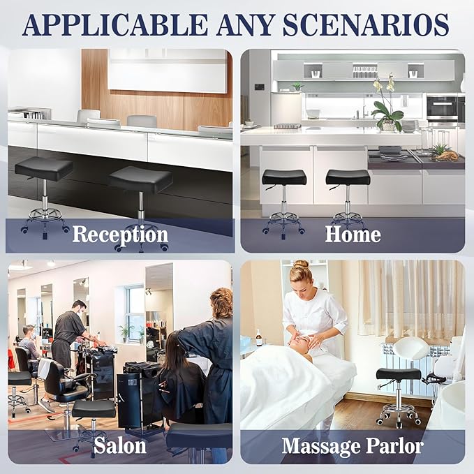 - New Upgraded Stool - This versatile, space-saving, compact esthetician stool is an ideal piece of furniture for a variety of places, such as salons, medical treatments, spas, massages, eyelash studios, tattoo studios, and beauticians. It is also easy to install. The screws of our sitting stool with rollers are already fixed on the seat cushion. You only need to install the gas rod on the base, insert the base into the wheels, and insert the seat cushion into the gas rod. It will take less than 3 minutes.