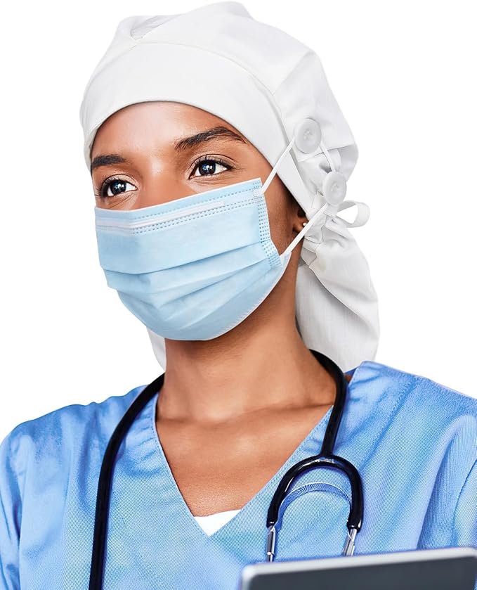 - Free Both ears with 4 Buttons - 4 buttons around ear side can avoid the straps to make your ears hurt or get wrinkles on face.With the buttons,you even forget you have put on the scrub cap all day.