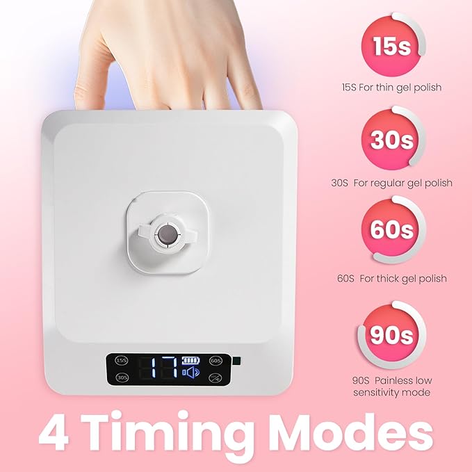 - 【Timing Mode】 This UV feet lamp features 4 selectable timing modes (15S/ 30S/ 60S/ 90S), which can be chosen and switched by pressing the timing button. After pressing the desired time button, the UV lamp will turn on directly and the countdown will also commence on the display. It will automatically turn off upon reaching the set time.