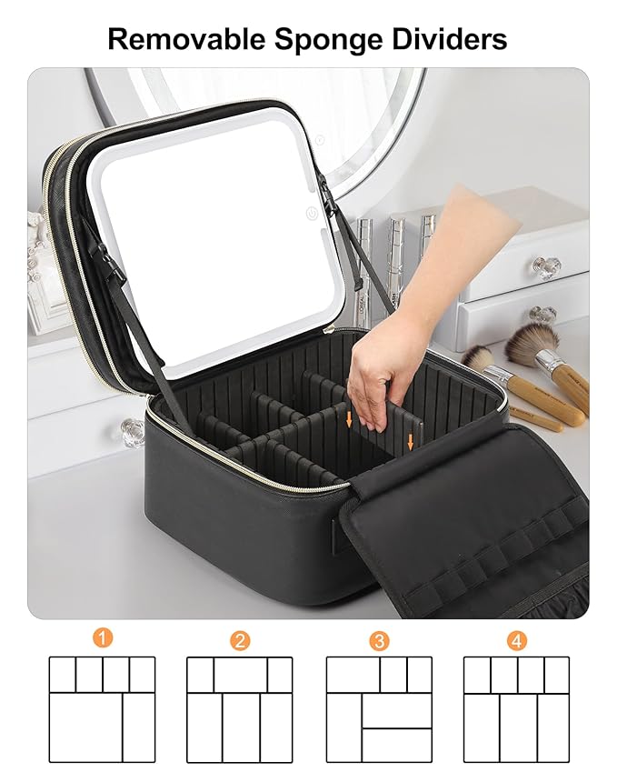 - PROFESSIONAL MAKEUP BAG WITH LED MIRROR: Travel makeup bag with a rechargeable lighted makeup mirror, it has 3 Color Lighting Modes (Cold Light, Natural Light, and Warm Light) & Brightness Adjustment, adaptable to different environments and make-up needs. Gentle press the sensor switch to change the color of the light, and long press to adjust the brightness of the light