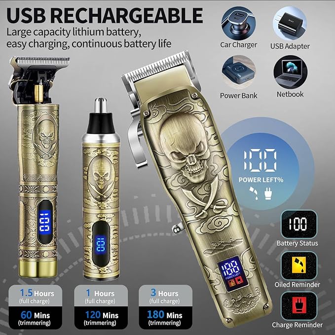 - ULTRA-LONG BATTERY LIFE: Our cordless hair clippers have a built-in high-capacity lithium battery that runs up to 180 minutes after 3 hours of charging (large), 60 minutes after 1.5 hours of charging (small), electric shaver can run 120 minutes after 2 hours full charge, and 120 minutes after 1 hour of charging (ear and nose trimmer). The LED display clearly shows power left, oiling and charging reminder. You can visually monitor the power consumption and status of the mens clipper trimmer set.