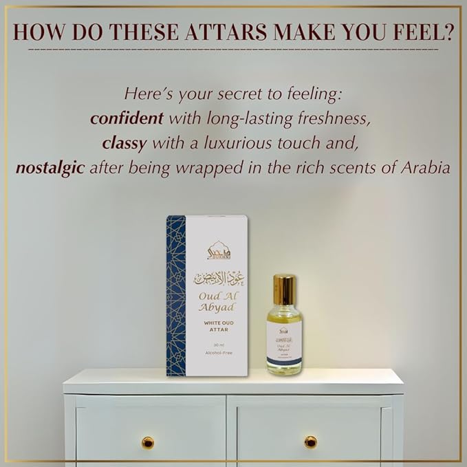 - Product Highlights: 30ml Oud Al Abyad عطر العود الابيضه roll-on unisex attar oil. This attar perfume oil offers a convenient size for on-the-go application, allowing you to experience the undeniable power of white oud anytime, anywhere