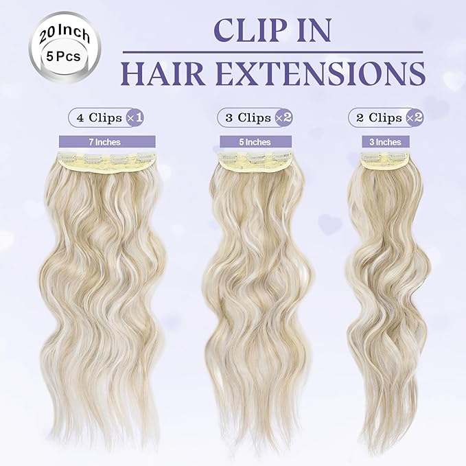Clip in Hair Extensions for Women 20 Inch 5Pcs Long Wavy Curly Ash Blonde Highlight Hair Extensions Clip ins Full Head Synthetic Hair Extension for Women