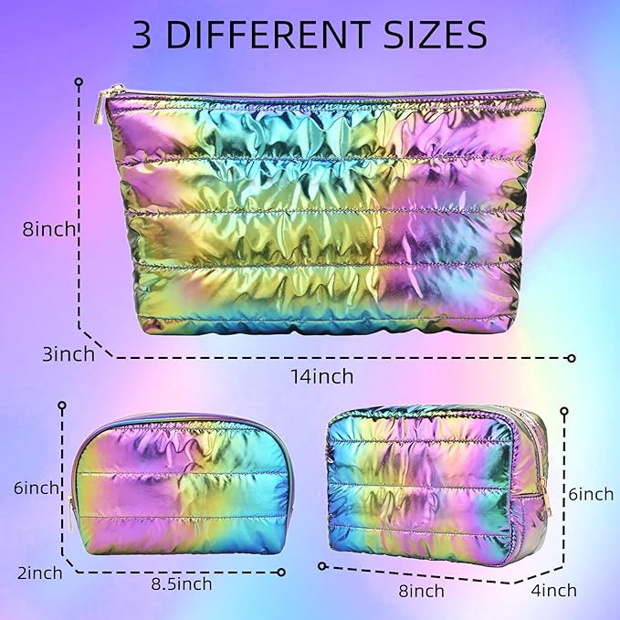 - 【Different Size】 The Iridescent puffer makeup bag set has 3 different size. Big size: 14 x 9 inches, medium size: 8 x 6 inches, small size: 8.5 x 5.5 inches. The large bag is ideal for holding all your essential cosmetics and skincare products and two small bags are perfect for organizing smaller items or travel essentials.