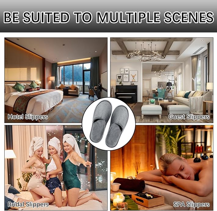 - [Widely used] Slippers for men and women. Each pair of slippers has its own packaging bag. Ideal for hotels, spas, conference centers, motels, air Tours, family slippers and other commercial uses. Suitable for Airbnb guests, vacation rentals, birthday parties, parties, wedding receptions, hotels, restaurants, family gatherings, flights, travel, etc.