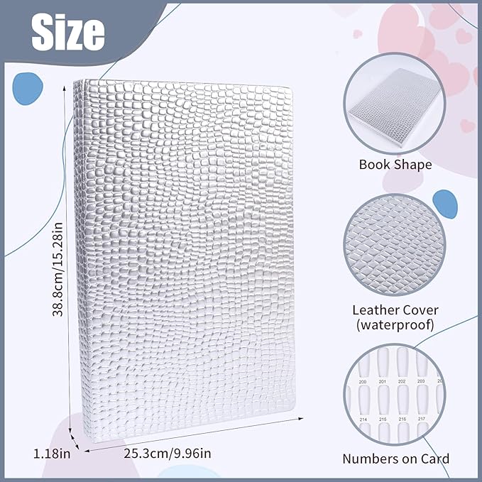 - HIGH QUALITY NAIL ART POLISH COLORS DISPLAY: The color swatch book is made of High -quality waterproof PU Leather,Designed with 308 rooms for storing finished nail art tip or nail polish colors design, durable and easy to clean,the package includes 1xColour display book, 480 x False nail tips,1-400 Number Label Stickers,2x double sided tape .Tips: Dear customer, due to the material of the color card book, there may be a little smell after you receive it. You can open the color card book and ventilate it for a few days, and there will be no smell