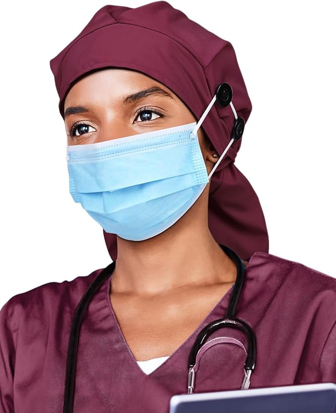 - Free Both ears with 4 Buttons - 4 buttons around ear side can avoid the straps to make your ears hurt or get wrinkles on face.With the buttons,you even forget you have put on the scrub cap all day.