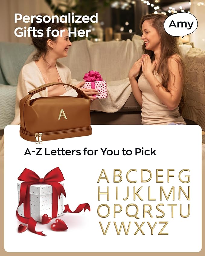 - 【Double-layer Design】The monogrammed makeup bags is double-layer with a unique design of upper and lower storage areas. The bottom compartment is great for storing cosmetics, eye shadows, makeup brushes, and other items. The top layer features a large opening for easy access, along with two small compartments for lipsticks and earrings.
