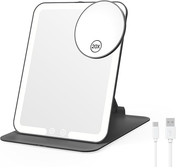 Benbilry Foldable Travel Makeup Mirror with Lights and 20X Magnification, Rechargeable Tabletop LED Vanity Mirror with Adjustable Stand, 3-Colored Dimmable Lighting, Portable Cosmetic Mirror, Black