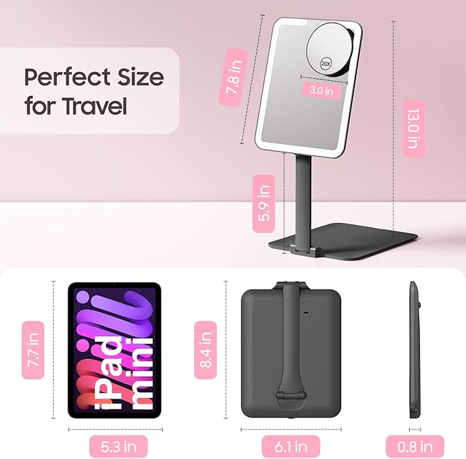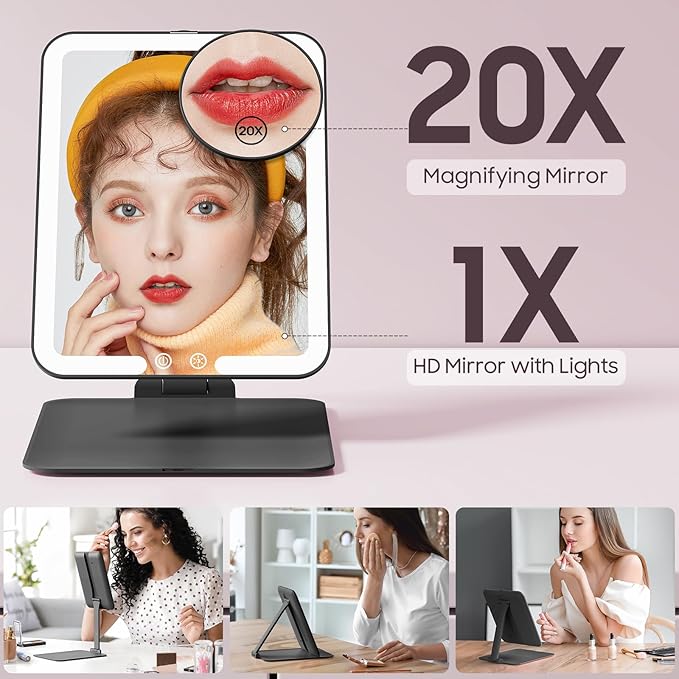- Detachable Magnetic 20X Magnifying Mirror: Innovative magnetic design, it can be firmly attached to the 1X HD Makeup mirror. The 1X mirror with Light is perfect for overall makeup and styling, while the 20X magnifying mirror allows you to focus on your detailed facial features to achieve a flawless makeup look, fitting for home, travel or working use