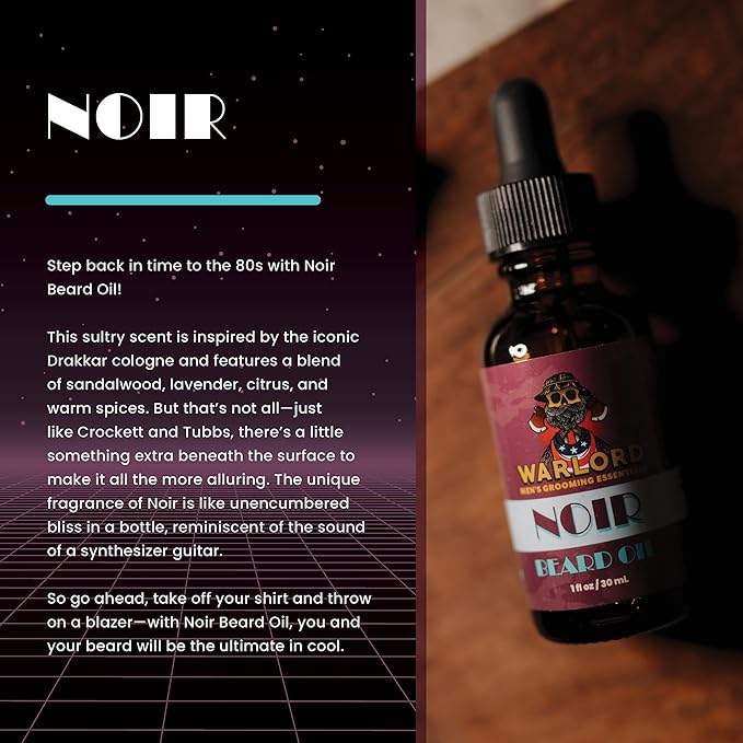 - Potent & Nostalgic Scent - Noir - Turn your beard into a time machine because real men’s grooming kits deserve classic swagger and beard-softening magic. A sultry, nostalgic scent inspired by the iconic Drakkar cologne. Noir Beard Oil combines sandalwood, lavender, citrus, and warm spices, offering a smooth, sophisticated fragrance that embodies the bold confidence and free-spiritedness of the 80s.