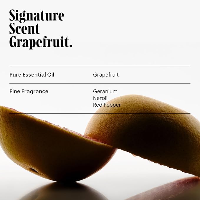 - Pure Grapefruit Oil is paired with fine fragrance notes of Geranium, Neroli and Red Pepper for a fresh experience.