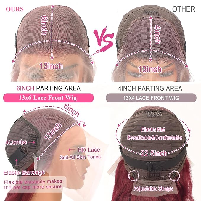 - 【Red Human Hair Wigs for Women Cap Details】: 99j Burgundy Body Wave Lace Front Wigs Cap Size Adjustable 21.5 To 23.5. It Fits Most People. Elastic Straps and 4 Combs to Help You Fix the Wig, Wear and go Glueless Wig,Safe and Flexible, Easy to Wear, Comfortable and Breathable, Easy to Adjust, Match Head Perfectly.