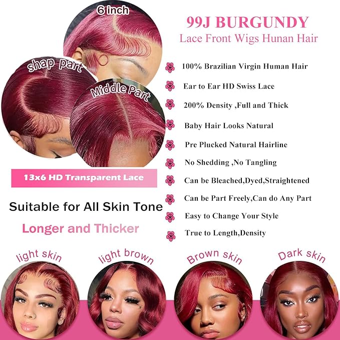 - 【Burgundy 13x6 Lace Frontal Wigs Human Hair Advantage】:200% Density Body Wave Human Hair Wig Full and Thick, No Smell, Soft, Shedding Free, Tangles Free,True to Length and Weight.Swiss Lace Suitable for All Skins,Invisible Small Hair Knots,Can Be Dyed&Bleached, Straightened and Restyled, 13x6 Deep Parting Space,Can Be Side Part, Middle Part, High Ponytail& Bun, Styled As You Like.