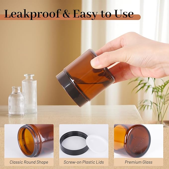 - PREMIUM AMBER GLASS CONSTRUCTION: Crafted from thickened food-grade glass, these amber glass jars with lids are free of lead and BPA for safe storage of edibles, body butters, and candle-making materials 100% recyclable amber hue blocks UV rays to protect light-sensitive contents