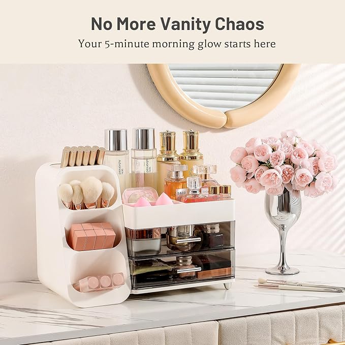 - Multi-Compartment Cosmetic Organizer: Features 2 drawers, 4 brush holders, and 4 height-free sections. Store lipsticks, eyeliners, creams, and palettes in sections, and masks or jewelry in drawers. Perfect as a Bathroom Countertop Organizer