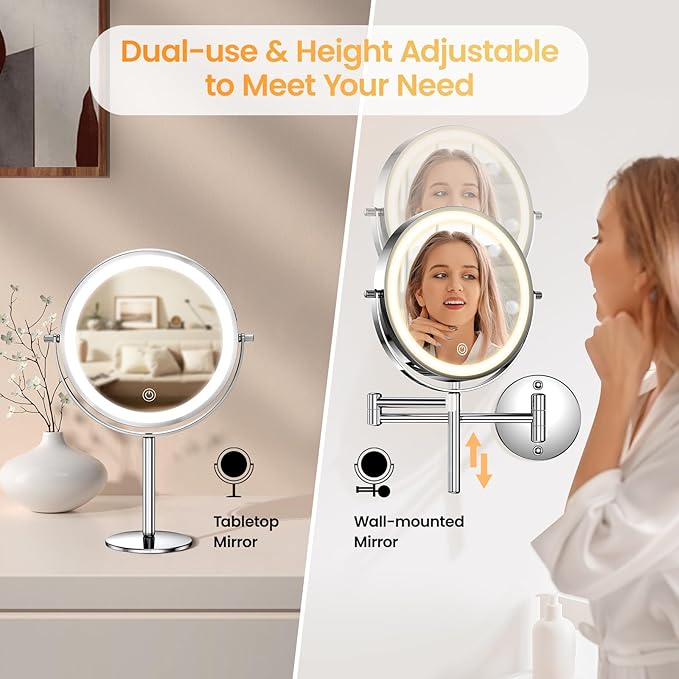Benbilry Lighted Wall Mounted Makeup Vanity Mirror with Magnification 10X/1X, Adjustable Height & 3 Color Lights, Rechargeable 8" Dual Use Magnifying Tabletop Mirror, 360° Swivel with Extendable Arm