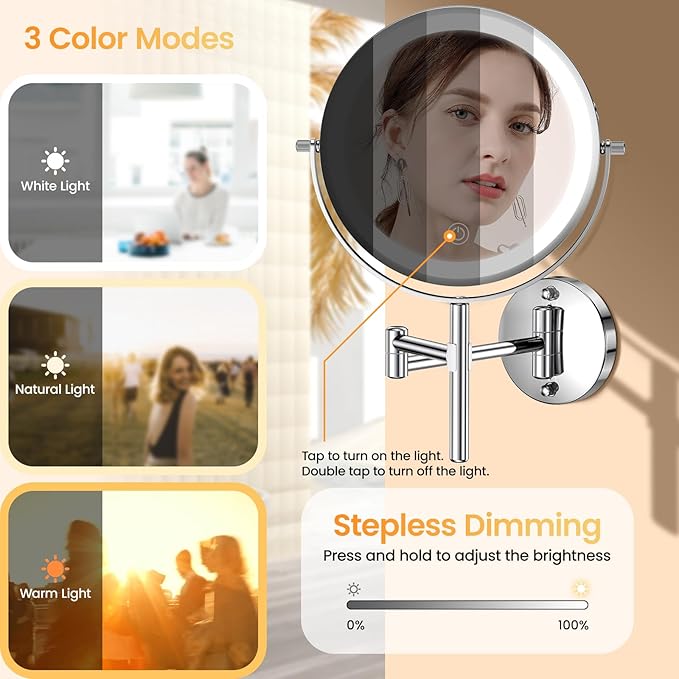 - 【3 COLOR LIGHTS & STEPLESS DIMMING】 The magnified cosmetic mirror offers 3 light settings: white light, warm light, and natural light. Just short press the touch sensor switch to change the 3 light colors. Press and hold to adjust the brightness. You can tap to turn on the light, and double tap to turn off the light. It even saves energy with an automatic 30 mins shut-off feature