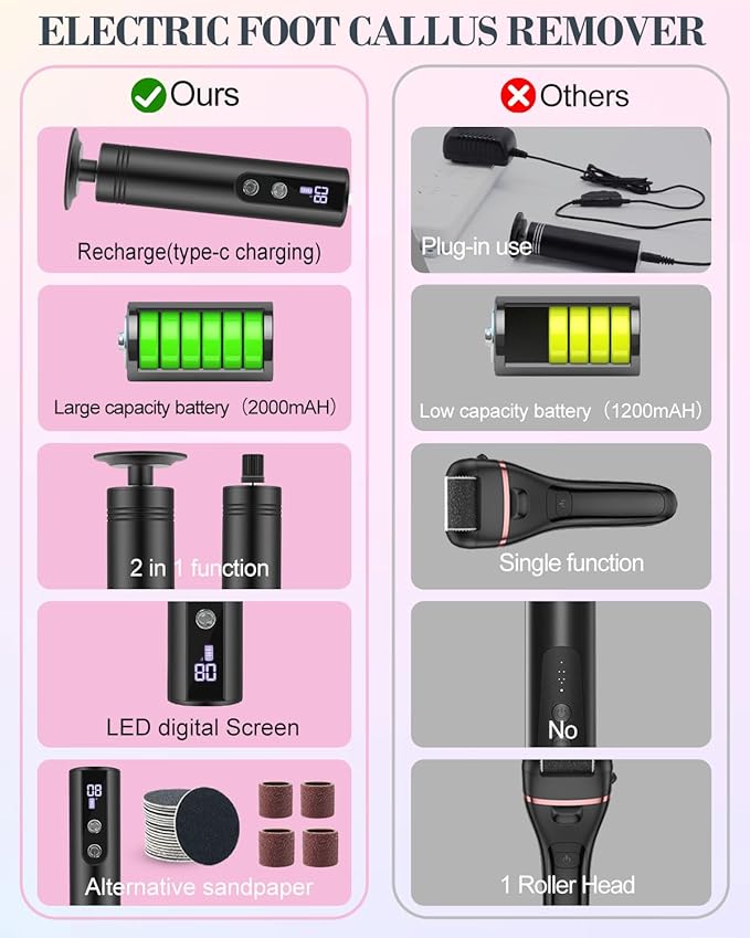 - Replaceable Heads: Includes a coarse sandpaper disk for callus removal and two nail drill bits for precision nail grooming.