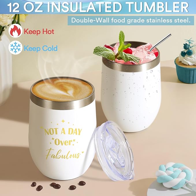 - BEST BIRTHDAY GIFTS FOR WOMEN SHE’LL ADOREL: Treat her to a lavish birthday surprise! Our 12oz tumbler with special message "NOT A DAY OVER FABULOUS" in the happy birthday gifts box for woman is made of vacuum-insulated stainless steel which keeps drinks cold for 8 hours and hot for 4, also includes a straw and cleaning brush for convenience. Write down your personalized blessings on the customized greeting card for heartfelt wishes. Packed in a vibrant gift box, it’s the ultimate pampering kit to celebrate her special day.