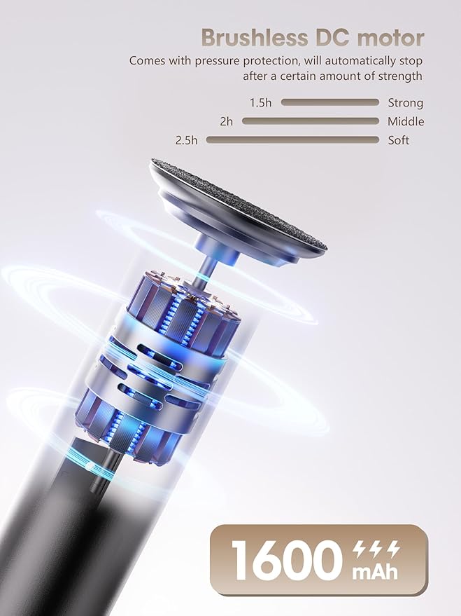 - High Quality - The electric foot file is made of high quality aluminium case and polished smooth, more comfortable to use. Built-in 1600mAh high-capacity battery with high-quality gear motor, strong power, longer life. Equipped with USB-C charging port, more convenient to charge.