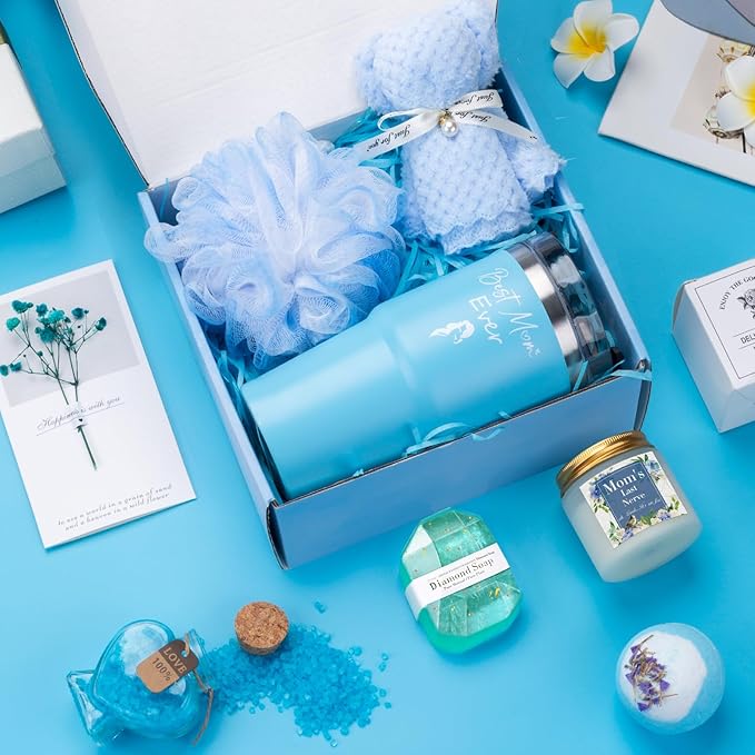 - GIFT BASKET FOR MOM - Mom gift box is a practical and thoughtful choice, featuring a 20oz wine tumbler (including stainless straw), scented candle, bath salt, bath bomb, Bath Loofahs, Bear Towel, Handmade Soap and a heartfelt greeting card with dry flowers. Indulge her senses with the best mom gifts, designed to bring relaxation, tranquility, and happiness to her day.