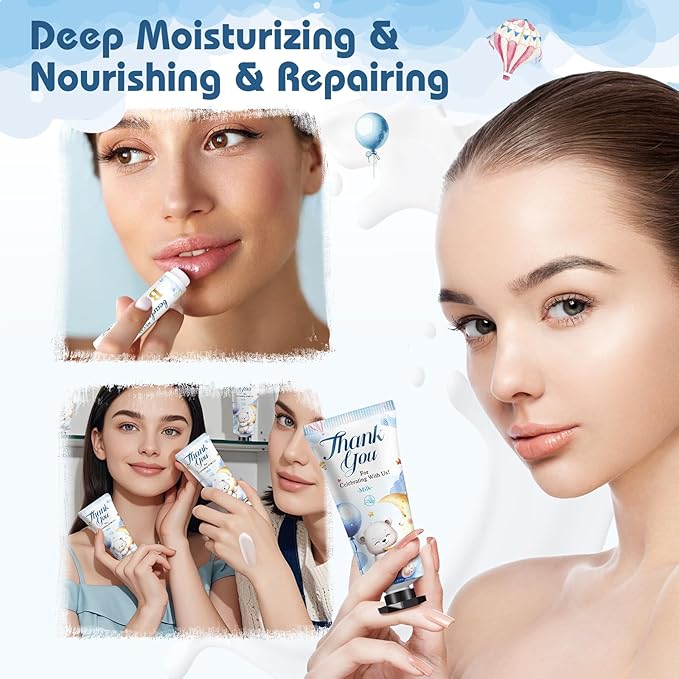 - 【50 Sets Bulk Gifts Hand Cream】This baby shower favors gifts set includes 50pcs lip balms with coconut scent,50pcs hand cream with milk scent,50pcs organza gift bags,50pcs thank you cards and 1pcs operation instruction.Cute packaging,sufficient quantity,thank you to the guests who celebrated with you