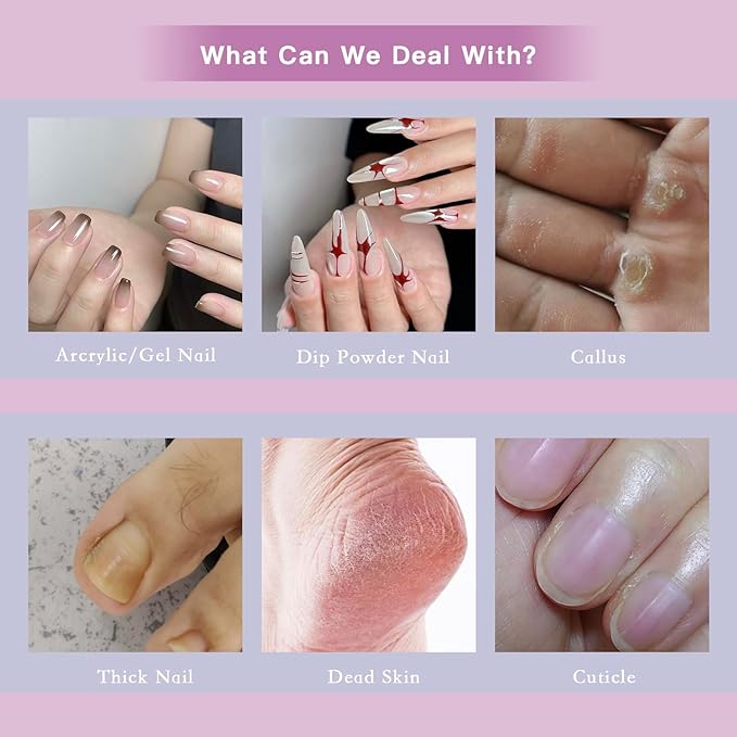 - 6 Speed Adjustable, Reversible Direction: Nail filer electric upgraded powerful motor and adjustable speed, 6 adjustable speeds 5000-30000rpm, pause function and F/R direction function for all your manicure and pedicure needs, including removing acrylic nails, poly gel nails, beetles gel, dip powder nails, thick nails, etc.