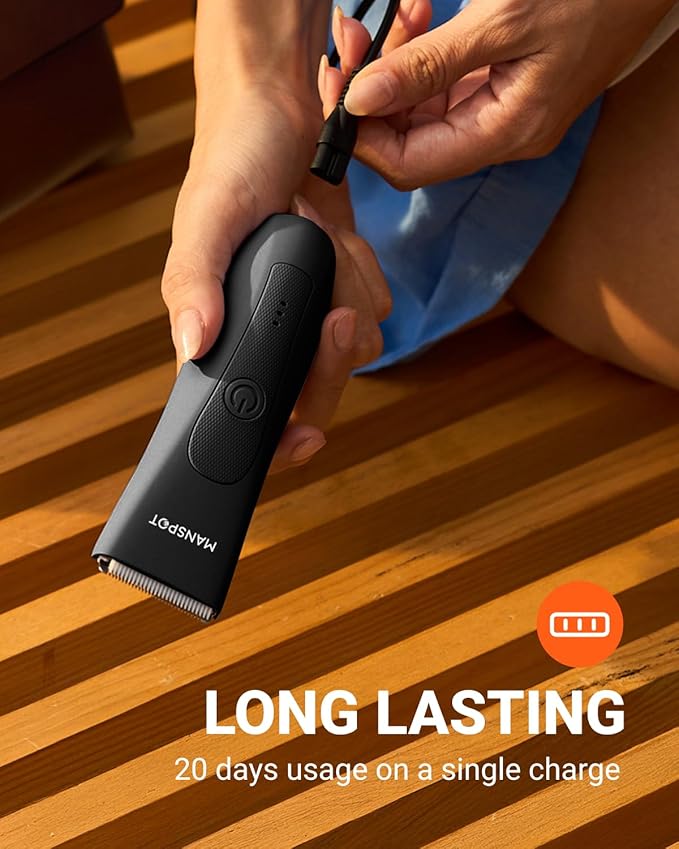 - Long-Lasting and Rechargeable: Step into the world of sustainable grooming with MANSPOT! Our rechargeable body trimmer is designed to save you time and money, with a powerful battery that lasts up to 20 uses per charge, you can stay perfectly groomed without any worries on the go or travel, perfect companion for all your grooming routines.